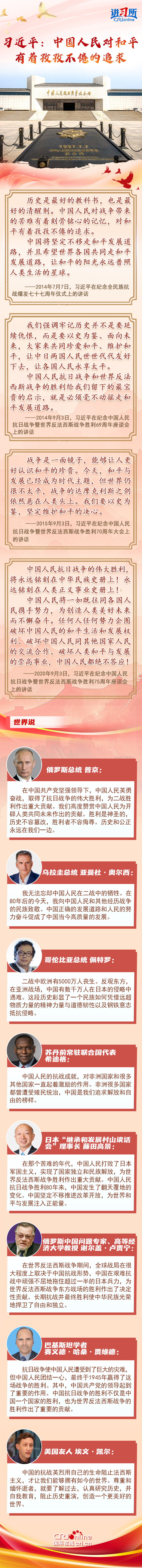 “中國(guó)人民抗日戰(zhàn)爭(zhēng)和世界反法西斯戰(zhàn)爭(zhēng)的勝利給我們留下的最寶貴的啟示,就是必須毫不動(dòng)搖走和平發(fā)展道路?!弊鳛槭澜缟衔ㄒ粚⒑推桨l(fā)展寫入憲法和執(zhí)政黨黨章、上升為國(guó)家意志的大國(guó),中國(guó)始終從歷史中汲取智慧和力量,堅(jiān)定捍衛(wèi)來(lái)之不易的勝利成果。在國(guó)際友好人士眼中,中國(guó)為世界反法西斯戰(zhàn)爭(zhēng)東方戰(zhàn)場(chǎng)的勝利作出了決定性貢獻(xiàn),中國(guó)正確的發(fā)展道路和人民的努力奮斗促成了中國(guó)當(dāng)今高質(zhì)量的發(fā)展,為世界和平與發(fā)展注入正能量。