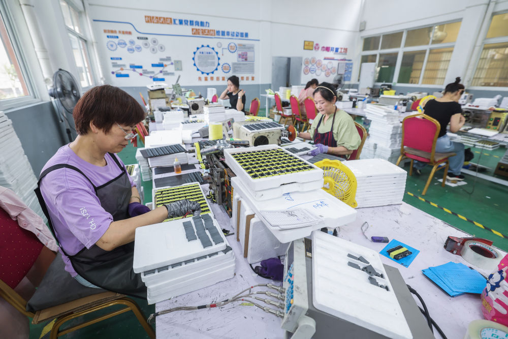 2025年6月19日,村民在浙江省海寧市鹽官鎮(zhèn)桃園村紅“芯”共富工坊內(nèi)工作。該共富工坊針對有靈活就業(yè)需求的低收入村民,采用“靈活就業(yè)+固定用工”彈性用工方式,促進(jìn)群眾就業(yè)增收。