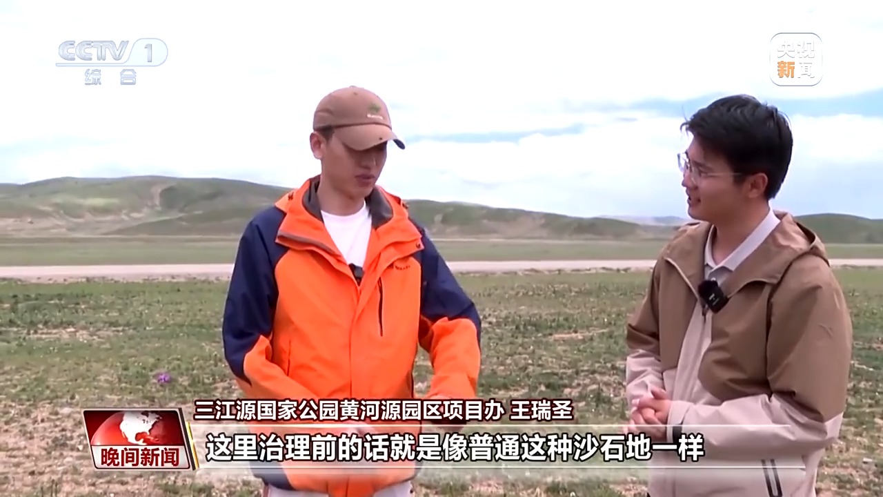 三江源國(guó)家公園黃河源園區(qū)項(xiàng)目干事 王瑞圣:這里治理前就像普通沙石地一樣,治理完的成效就是這樣子的,我們的草籽就在當(dāng)時(shí)切割的凹槽里面生長(zhǎng),這些草籽好多根部已經(jīng)進(jìn)行分裂了,所以會(huì)顯得非常茂密。