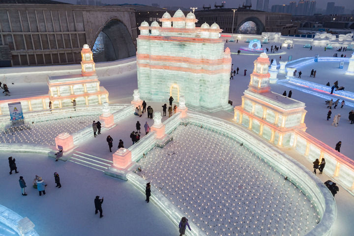 2023年2月1日,游客在哈爾濱冰雪大世界園區(qū)冰雪景觀《勝利之城》周邊游玩,該冰雪景觀以印度的法塔赫布爾西格里城為原型設(shè)計(jì)建造(無(wú)人機(jī)照片)。此屆哈爾濱冰雪大世界將上合組織成員國(guó)的特色建筑以冰雪景觀的形式呈現(xiàn)。新華社記者 謝劍飛 攝