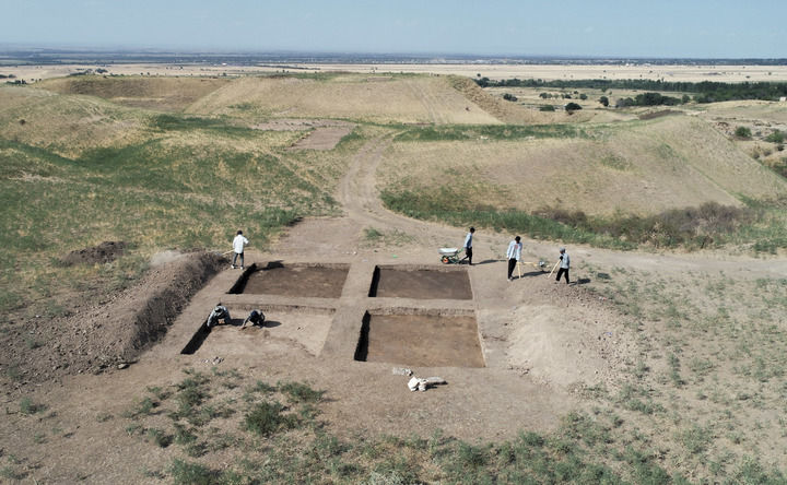 2023年8月9日,考古人員在中哈聯(lián)合考古項(xiàng)目拉哈特遺址探方上工作(無(wú)人機(jī)照片)。新華社發(fā)(奧斯帕諾夫攝)