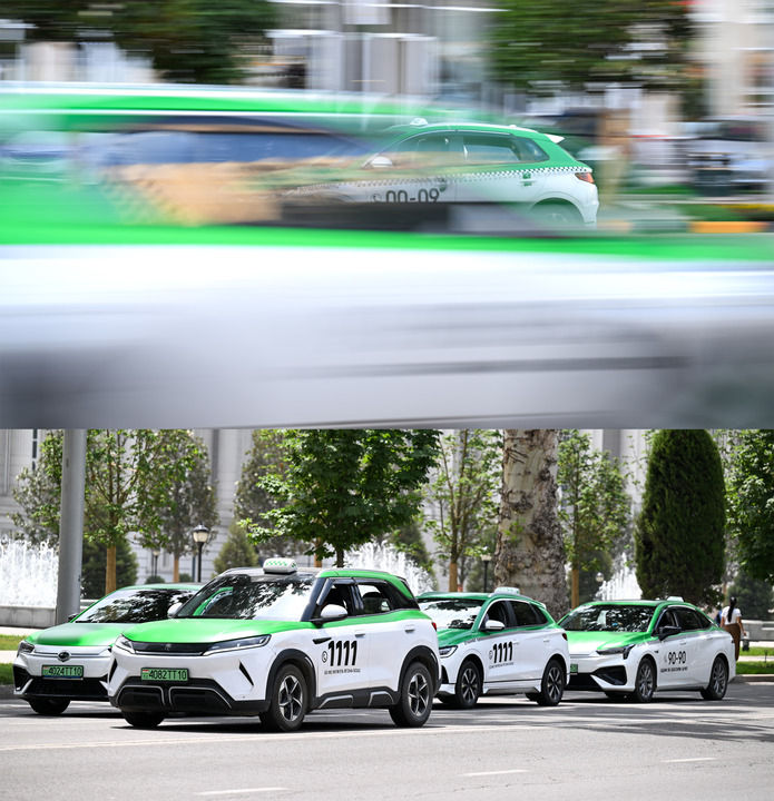 在塔吉克斯坦首都杜尚別,中國(guó)新能源汽車(chē)行駛在道路上(拼版照片,上圖攝于2025年5月28日,下圖攝于2025年5月29日)。新華社記者 李任滋 攝