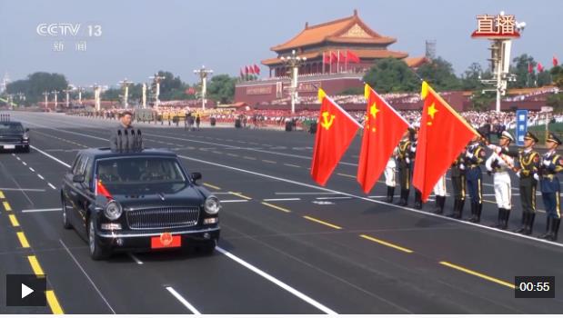 偉大旗幟光耀千秋。中國共產(chǎn)黨黨旗、中華人民共和國國旗、中國人民解放軍軍旗在受閱部隊最前方迎風招展。檢閱車行進至黨旗、國旗、軍旗前,敬禮號角響起,習近平停車肅立,以注目禮向三面旗幟莊嚴致敬。