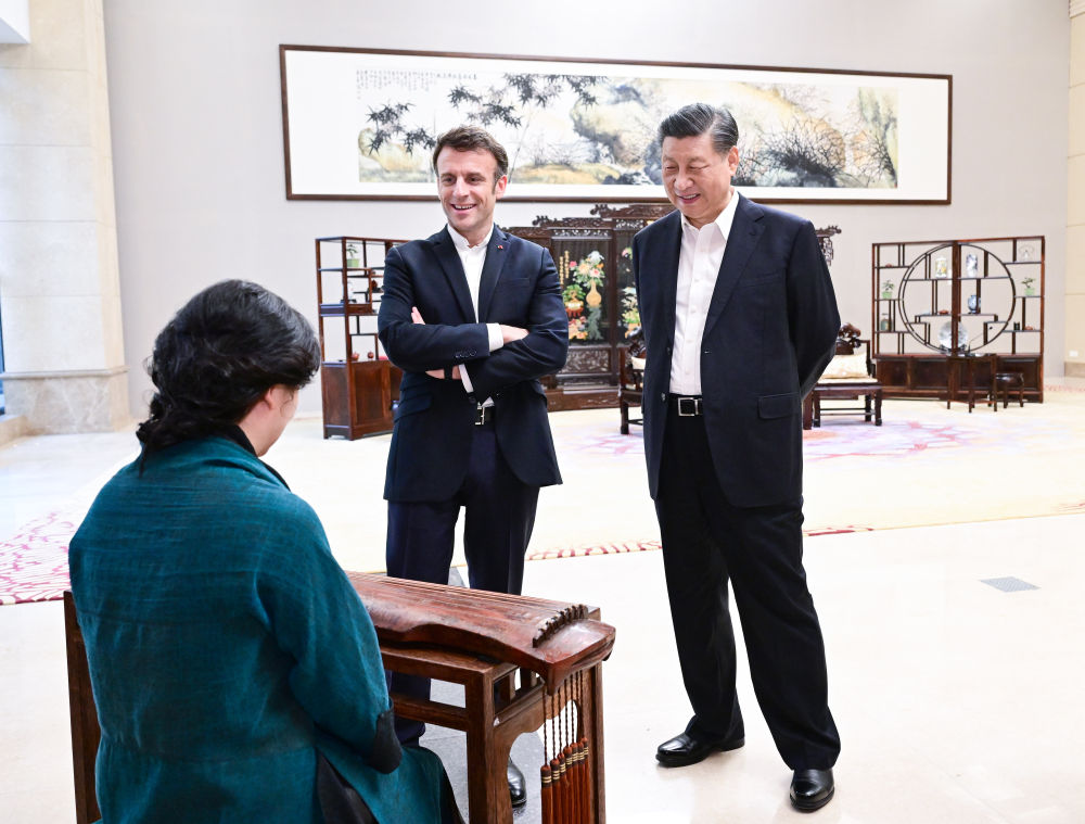 2023年4月7日,國家主席習(xí)近平在廣東省廣州市松園同法國總統(tǒng)馬克龍舉行非正式會晤。這是兩國元首在白云廳欣賞古琴演奏。新華社記者 岳月偉 攝