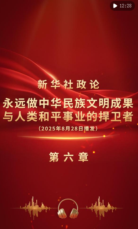 新華社8月28日播發(fā)《新華社政論|永遠(yuǎn)做中華民族文明成果與人類(lèi)和平事業(yè)的捍衛(wèi)者——寫(xiě)在中國(guó)人民抗日戰(zhàn)爭(zhēng)暨世界反法西斯戰(zhàn)爭(zhēng)勝利80周年之際》。我們邀請(qǐng)誦讀嘉賓劉勁演播“第六章”。