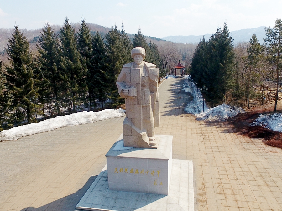 矗立在吉林省靖宇縣楊靖宇將軍殉國地的楊靖宇雕像(2017年3月22日攝)。新華社記者 曾濤 攝