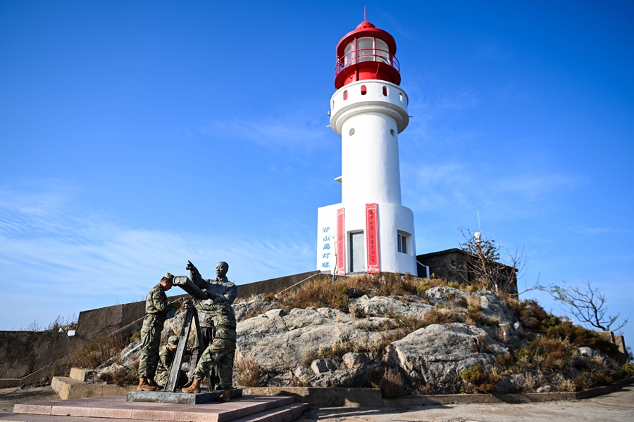 開山島守島民兵保養(yǎng)清潔王繼才雕像(2024年10月25日攝)。新華社記者 鄧華 攝