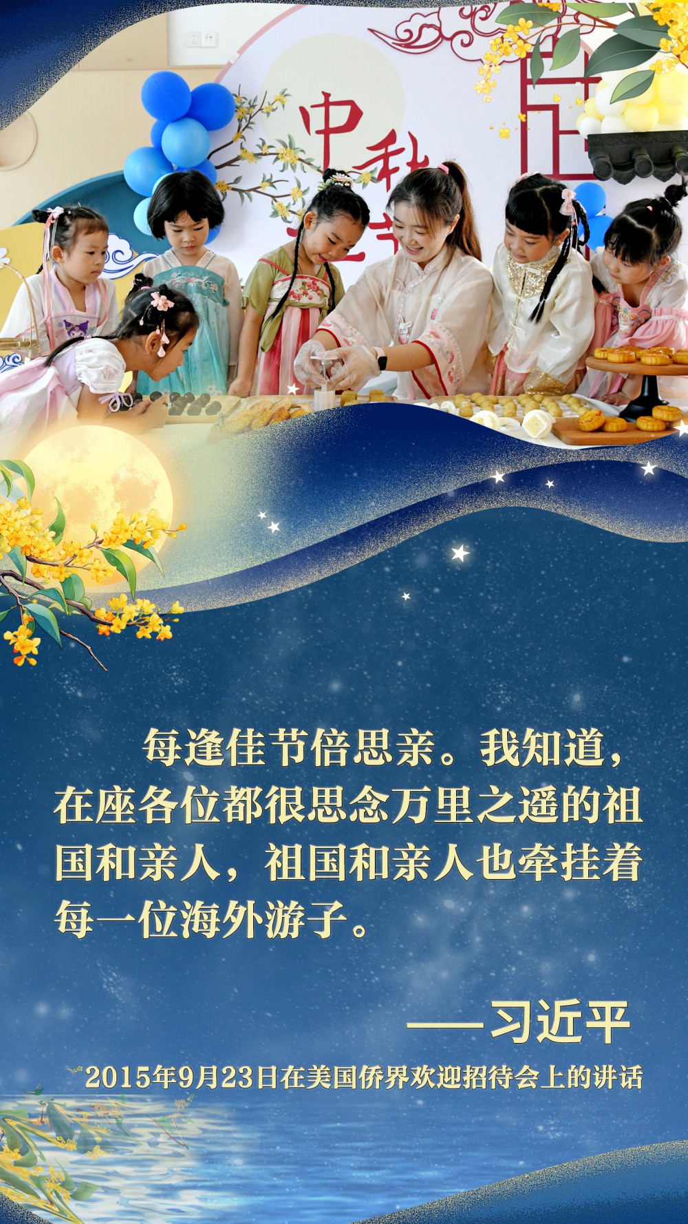 2015年9月23日,中秋佳節(jié)前夕,習近平總書記在西雅圖出席美國僑界歡迎招待會。他為參加招待會的同胞們帶去了來自家鄉(xiāng)的月餅,并熱情地“歡迎大家?;丶铱纯础薄?/p>
