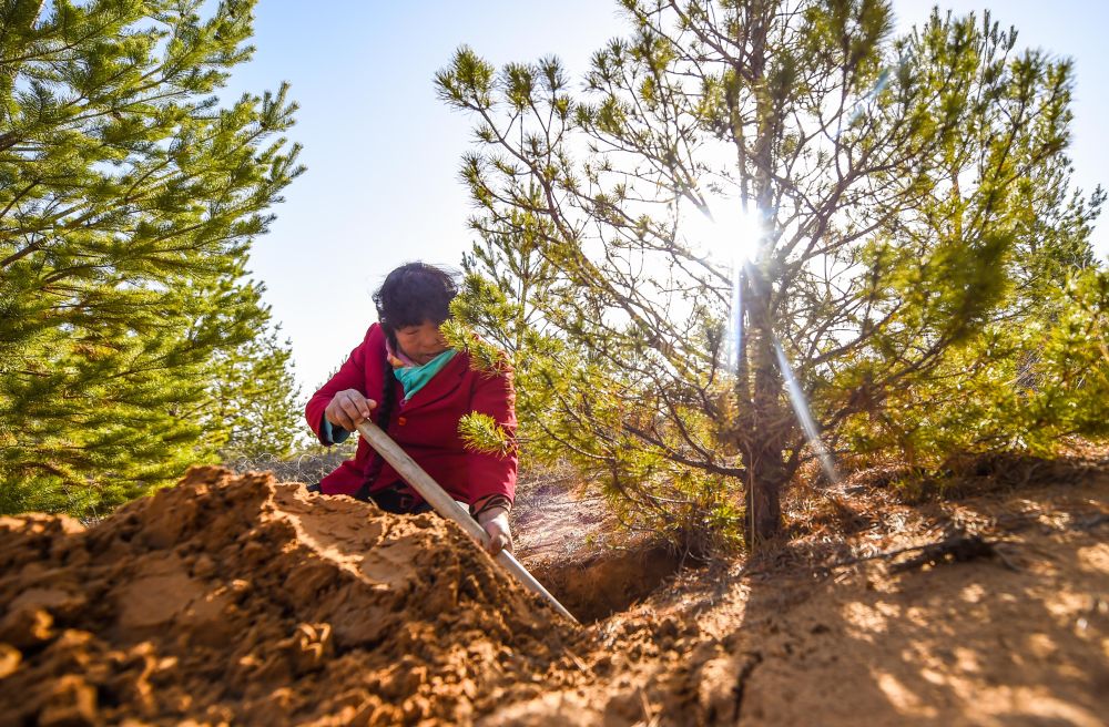 2021年3月23日,殷玉珍在內(nèi)蒙古毛烏素沙漠挖土,查看松樹根部的生長情況。20世紀80年代,殷玉珍嫁到這片沙地時,眼前只有漫無邊際的黃沙。1986年,她埋下第一棵樹苗,從此與風沙較勁。如今,7萬多畝荒沙披上了綠裝,治理好的土地上種起了小米,金燦燦的谷穗成了“沙漠黃金”。