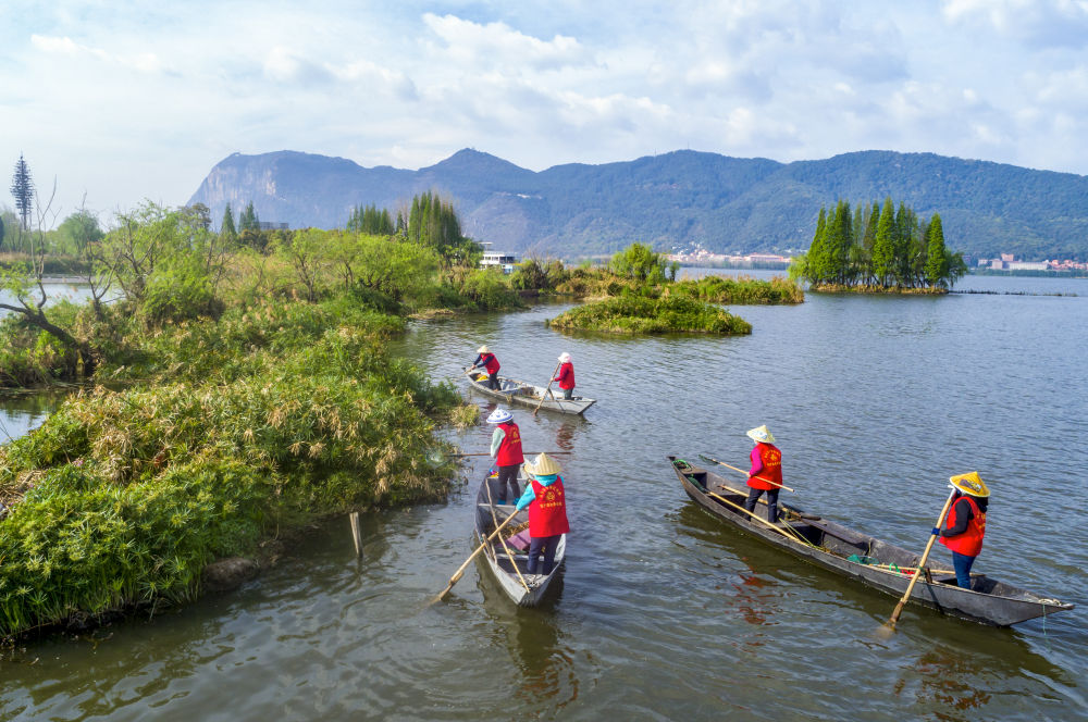 2023年3月20日,巾幗打撈隊隊員在云南昆明滇池草海打撈水草(無人機照片)。在云南昆明滇池邊,活躍著一支由當?shù)貗D女組成的巾幗打撈隊。數(shù)十年來,她們駕駛船只打撈滇池及周邊入湖河道、濕地的垃圾、雜草等。