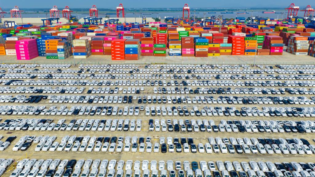 圖為10月4日在江蘇省港口集團南京港龍?zhí)陡蹍^(qū)拍攝的準(zhǔn)備裝船出口的汽車(無人機照片)。新華社發(fā)(楊素平攝)