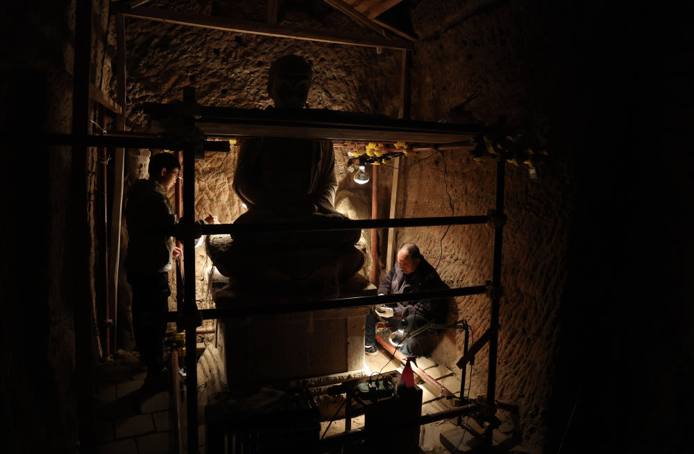 2024年11月2日,麥積山石窟藝術(shù)研究所保護(hù)研究室的文物修復(fù)師何舉在麥積山石窟133窟內(nèi)修復(fù)塑像。近年來,麥積山石窟藝術(shù)研究所等文物保護(hù)部門持續(xù)加大對麥積山石窟的搶救性保護(hù)和預(yù)防性保護(hù)工作力度,積極探索現(xiàn)代科學(xué)技術(shù)手段與傳統(tǒng)文物修復(fù)技藝相結(jié)合的保護(hù)修復(fù)新路徑。截至目前,麥積山石窟已有80個洞窟完成整體保護(hù)修復(fù)工作。