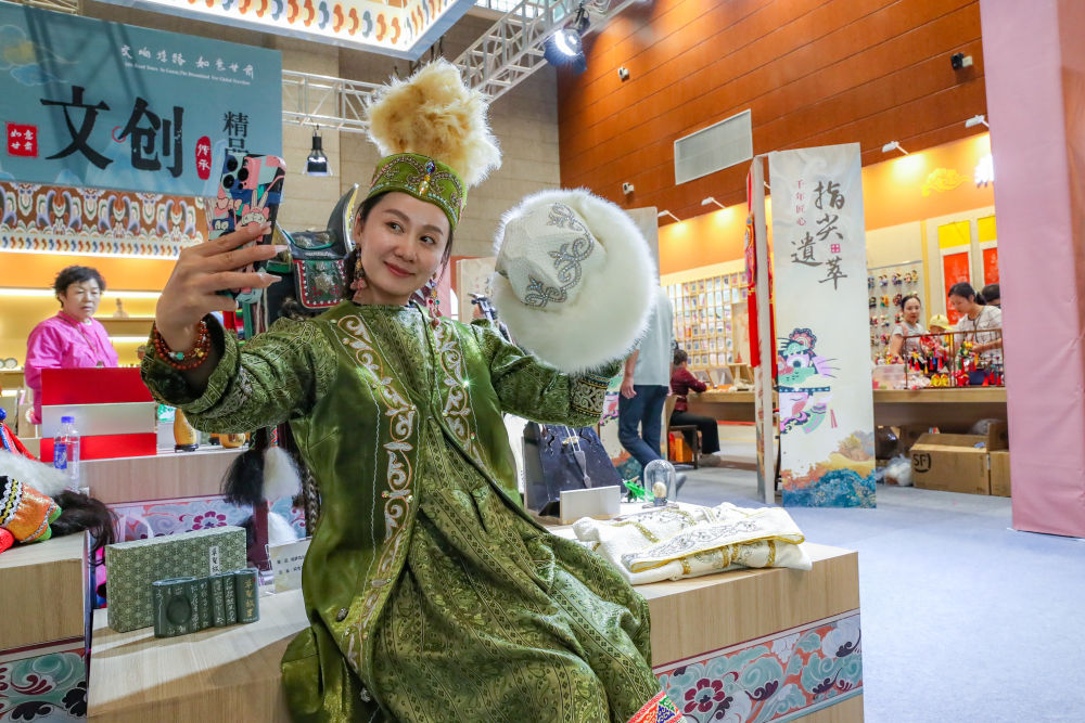 2025年9月22日,游客在敦煌文博會上身穿民族服飾自拍。9月20日至22日,第八屆絲綢之路(敦煌)國際文化博覽會在敦煌市舉行。敦煌研究院“典范”“高地”建設(shè)成果展、甘肅文旅非遺文創(chuàng)展、敦煌·絲路雕塑展等多項展覽同步亮相,集中展現(xiàn)了敦煌文化遺產(chǎn)保護(hù)、研究、弘揚的最新成果以及共建“一帶一路”國家的文化藝術(shù)、非遺文創(chuàng)、風(fēng)土人情等精彩內(nèi)容。
