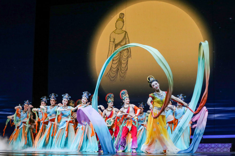 2025年9月22日,在敦煌舉辦的“相約敦煌”國際文化交流演出活動上,甘肅省演藝集團的演員展演《樂動敦煌》選段。《樂動敦煌》借助對莫高窟壁畫、藏經(jīng)洞古籍的解讀梳理,活化敦煌古樂器、古樂譜研發(fā)成果,通過全息投影等手段,結(jié)合專業(yè)演員的表演,將莫高窟壁畫中的樂舞盛景生動再現(xiàn),讓觀眾沉浸式感悟傳承千年的敦煌樂舞文化魅力。