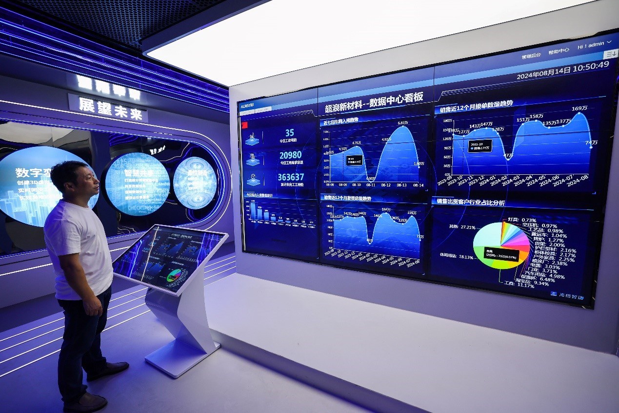 在金華市金東區(qū)江東鎮(zhèn)的浙江超浪新材料有限公司內(nèi),數(shù)據(jù)中心看板實時顯示企業(yè)流水線的各項生產(chǎn)數(shù)據(jù)。新華社記者 徐昱 攝