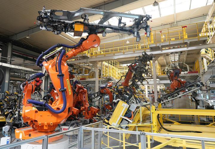 在位于浙江省臨海市的吉利汽車制造基地,機械臂在焊裝車間工作。新華社記者 翁忻旸 攝