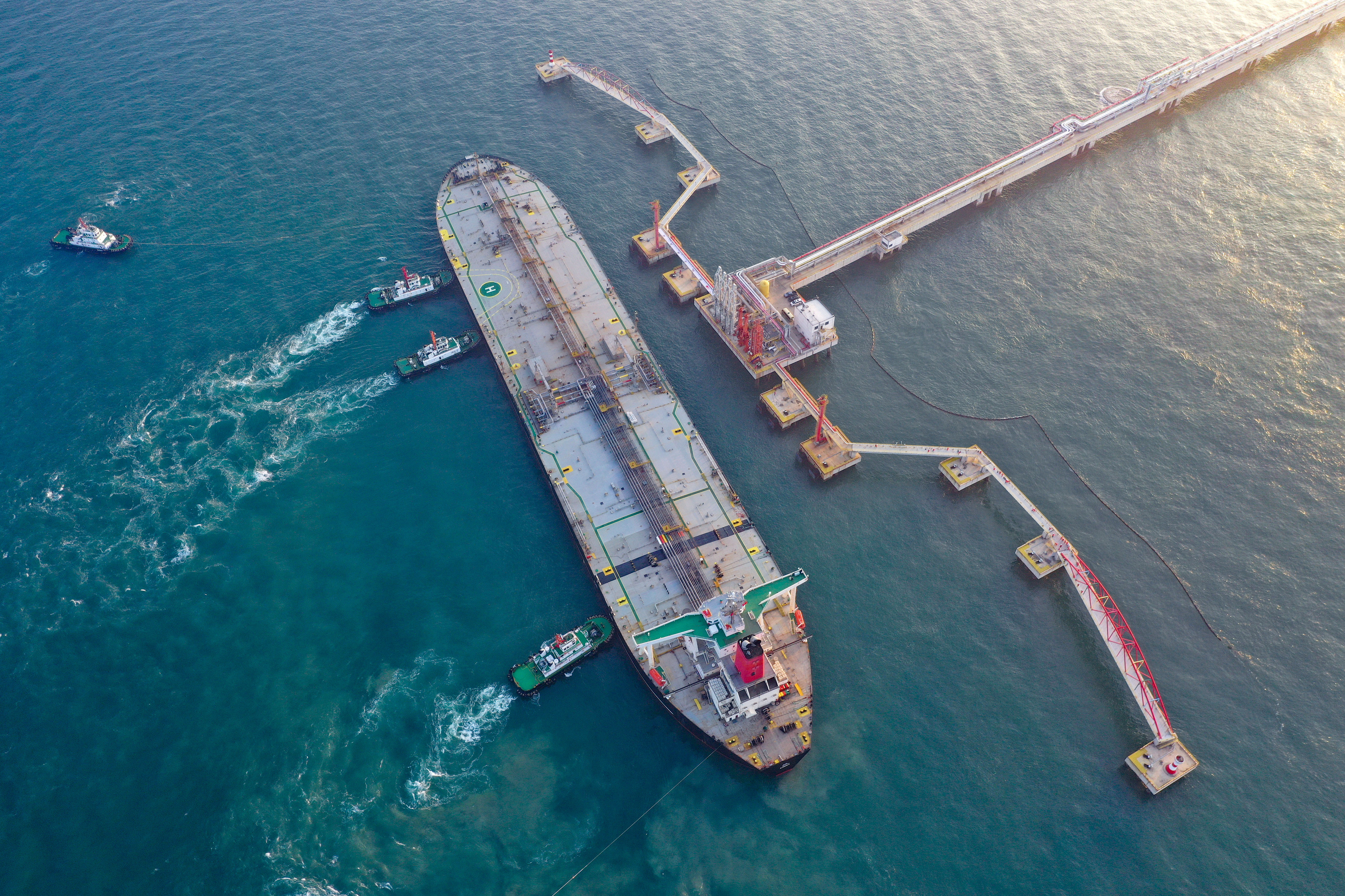 2025年12月18日,一艘裝載著17.9萬噸石化原輔料的船舶泊入位于海南省儋州市的國投洋浦油儲碼頭30萬噸級原油泊位(無人機照片)。