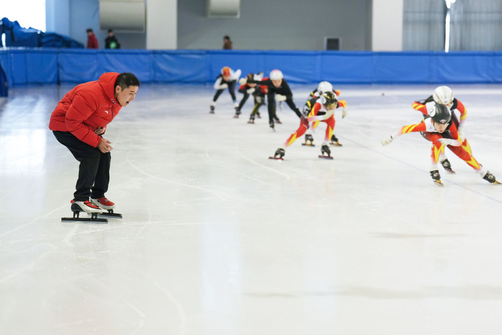 2025年1月24日,短道速滑教練姚忠華(左)在黑龍江省七臺河市短道速滑館指導(dǎo)運(yùn)動(dòng)員進(jìn)行冰上訓(xùn)練。十余年來,姚忠華累計(jì)執(zhí)教培養(yǎng)過200余名運(yùn)動(dòng)員。七臺河市擁有“奧運(yùn)冠軍之城”的城市名片,在這里,教練員們一起筑夢冰場,為我國冰雪人才的儲(chǔ)備奉獻(xiàn)自己的力量。