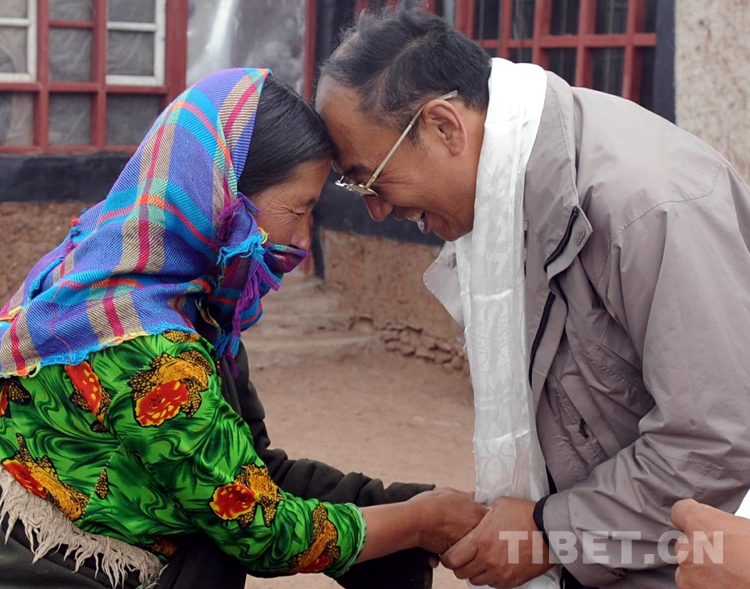 這是唐召明在藏北看望他曾幫助治療疾病的藏族婦女斯求卓瑪,并行藏族最高禮節(jié)——碰頭禮。(唐召明提供,2012年8月3日攝)