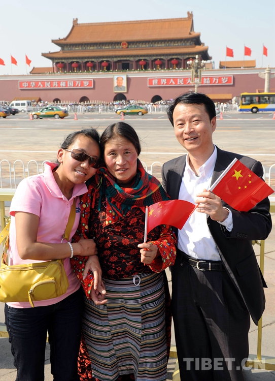 這是斯求卓瑪(中)和藏醫(yī)兼翻譯的旦增達色(左),以及一直幫助她的中石化首批援藏干部李一超(右)一起在北京天安門廣場合影留念。(唐召明2010年5月1日攝)