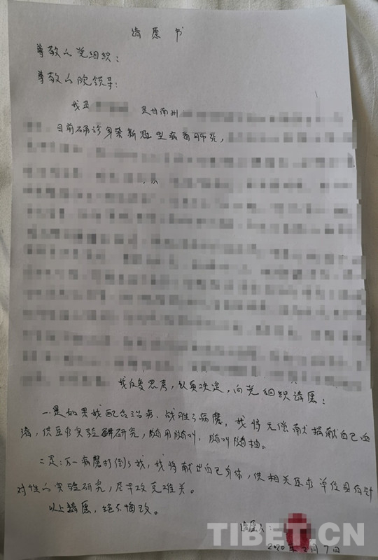 住院期間,索南吉的身份就是病人,對這個未知的疾病難免害怕,好的和不好的結(jié)局,她都反復(fù)想到了。作為一名參加過2003年非典和2010年甘肅舟曲特大泥石流一線救治工作的醫(yī)務(wù)工作者、有13年黨齡的共產(chǎn)黨員,她在住院的第2天,便向護(hù)士借來了筆和紙,在床頭向醫(yī)院鄭重寫下了請愿書:“一是如果我配合治療,戰(zhàn)勝了病魔,我將無償捐獻(xiàn)自己(的)血清,供醫(yī)療實驗研究。二是萬一病魔打倒了我,我將獻(xiàn)出自己身體,供相關(guān)醫(yī)療單位(開展)具有針對性的實驗研究,盡早攻克(新冠肺炎治療的)難關(guān)?!?/p>