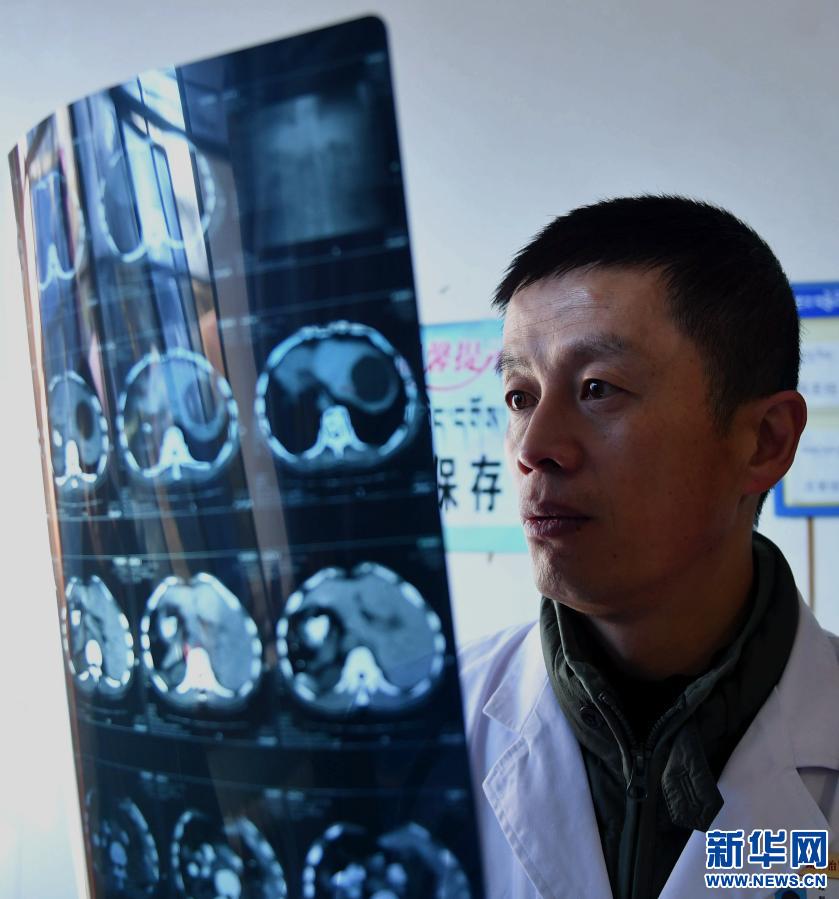 圖為西藏自治區(qū)第二人民醫(yī)院醫(yī)生張慶達(dá)在查看包蟲病患者CT片(2017年11月14日攝)。新華社記者晉美多吉 攝