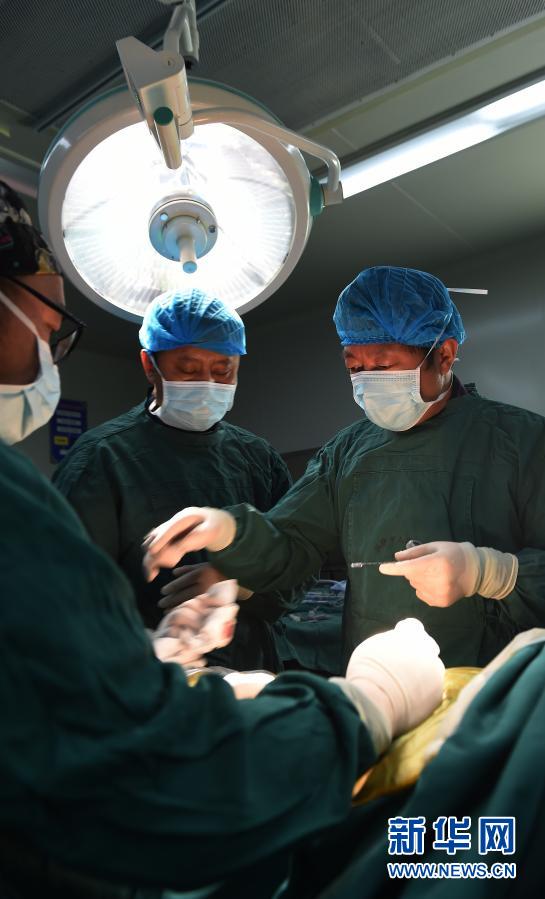 2017年5月26日,援藏醫(yī)生李家謀(右)帶領拉薩市人民醫(yī)院的藏族醫(yī)生進行微創(chuàng)脊柱手術。 新華社記者 覺果 攝