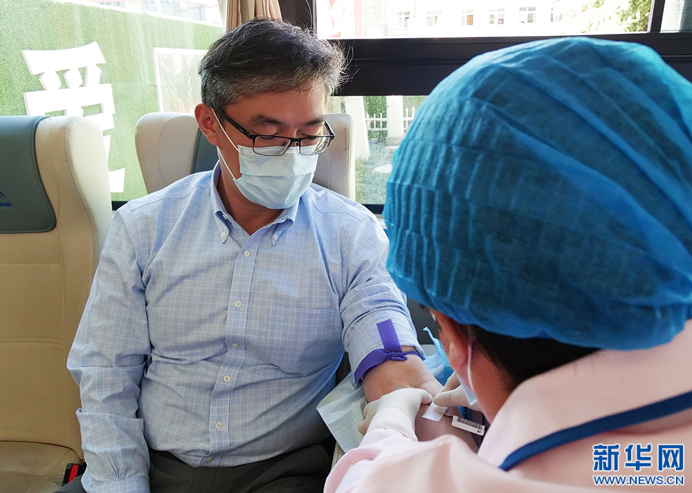 5月27日,來自北京大學(xué)人民醫(yī)院的援藏干部朱志峰在獻(xiàn)血。(新華網(wǎng) 旦增努布攝)