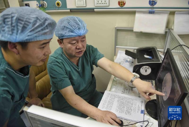2020年1月16日,在甘孜州人民醫(yī)院,王文濤(右)指導(dǎo)當(dāng)?shù)蒯t(yī)務(wù)人員。新華社記者 劉坤 攝