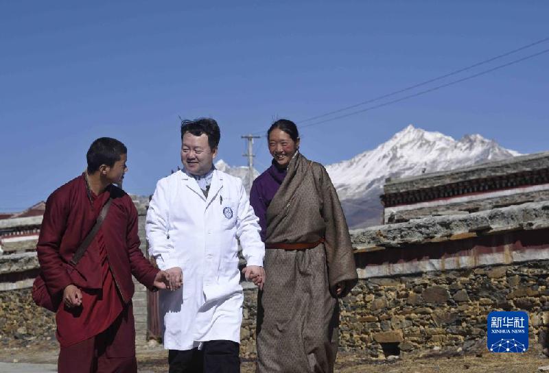 2020年1月17日,王文濤(中)在甘孜州回訪他治愈的包蟲(chóng)病患者。新華社記者 劉坤 攝