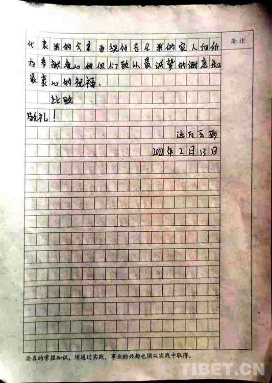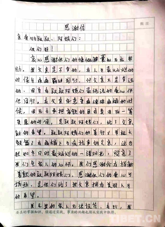 中國(guó)西藏網(wǎng)訊 “親愛的叔叔、阿姨們,您們好,衷心感謝你們的慷慨解囊和無(wú)私幫助......!”近日,西藏自治區(qū)林芝市巴宜區(qū)更章門巴民族鄉(xiāng)(以下簡(jiǎn)稱:更章鄉(xiāng))門仲村村民西繞多吉女兒達(dá)娃玉珍向更章鄉(xiāng)新時(shí)代文明實(shí)踐所發(fā)來(lái)了一封感謝信,字里行間充滿著感激之情,而背后的暖心故事更讓人溫暖與感動(dòng)。