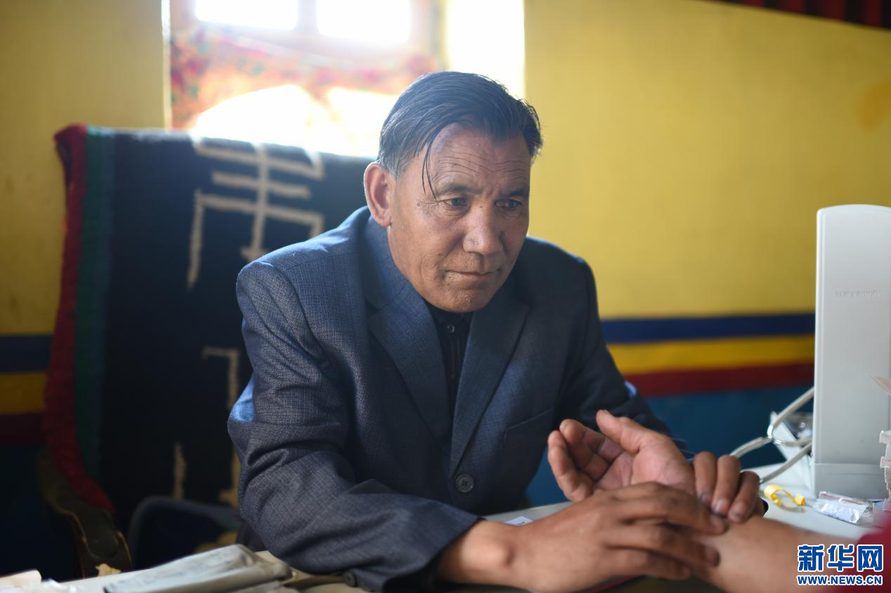 圖為西藏阿里岡底斯藏醫(yī)教學(xué)院校長才丹多吉在為患者把脈(4月20日攝)。新華網(wǎng) 旦增努布攝