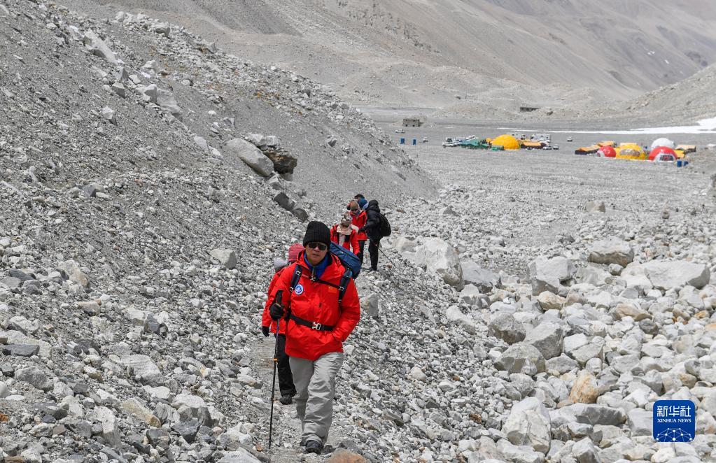 朱彤和科研人員在珠峰登山大本營(yíng)和絨布冰川間徒步穿梭(5月1日攝)。新華社記者 姜帆 攝