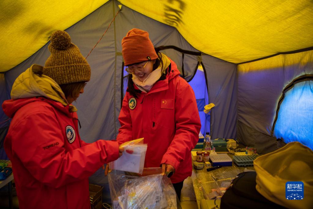 珠峰大氣與人體健康科考分隊(duì)成員在整理采集到的樣本(5月1日攝)。新華社記者 李鍵 攝