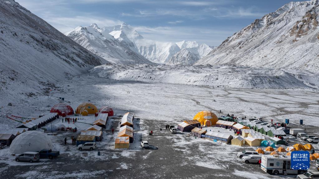 這是珠峰登山大本營(yíng)(5月1日攝,無人機(jī)照片)。新華社記者 孫非 攝