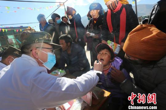 武警西藏總隊(duì)醫(yī)院巡診小分隊(duì)官兵在為林周縣覺(jué)布村的兒童檢查口腔。 余文彬 攝