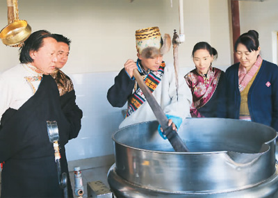 藏醫(yī)藥浴法代表性傳承人明珠(左)指導瀧沐覺堪(制藥師)煎熬“五味甘露”。關確才讓攝