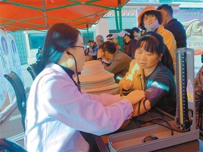 近日,由西藏林芝市人民醫(yī)院的醫(yī)護(hù)人員組成的志愿者服務(wù)隊(duì),走進(jìn)林芝市巴宜區(qū)為群眾送醫(yī)送藥送健康,把關(guān)懷送到群眾心中。圖為林芝市人民醫(yī)院醫(yī)護(hù)人員在巴宜區(qū)廈門廣場為群眾測量血壓。記者 張猛 史金茹 攝