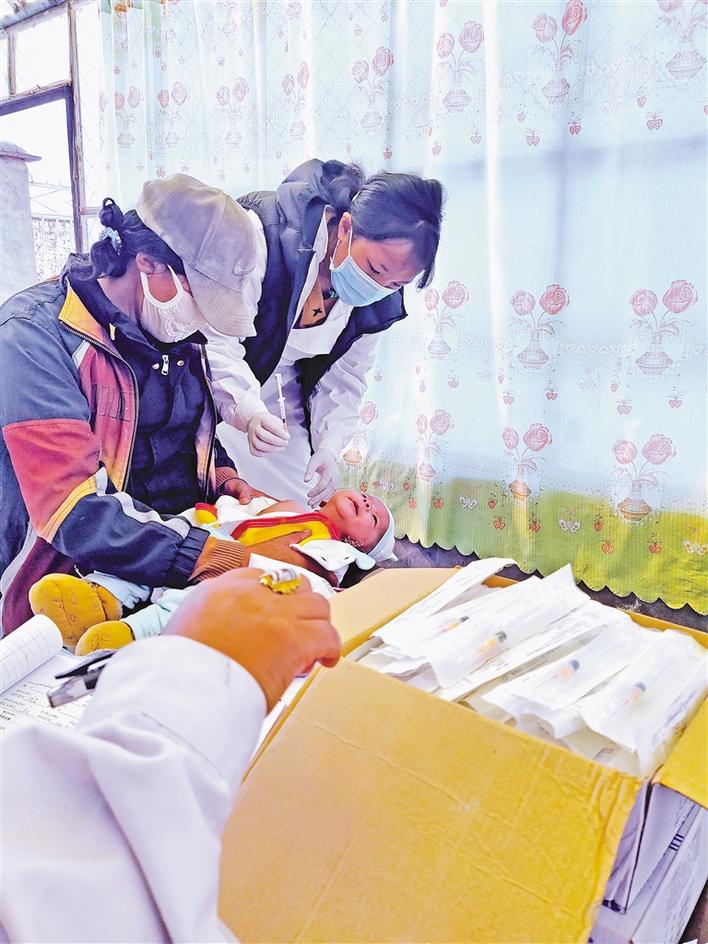 申扎鎮(zhèn)醫(yī)務人員為兒童注射疫苗。張宇 曲珍 攝