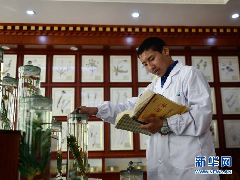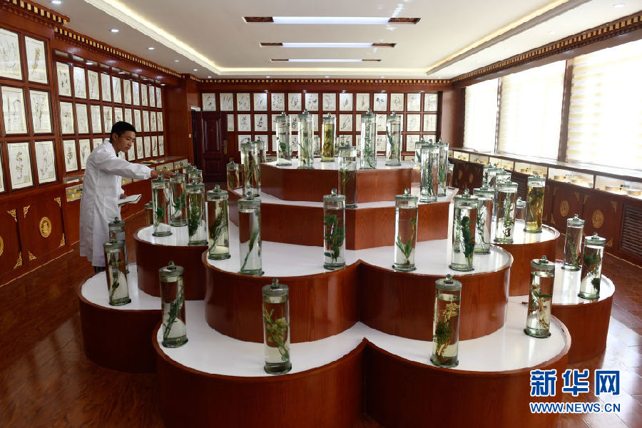 3月16日,在果洛藏族自治州職業(yè)技術(shù)學(xué)校,2020級(jí)藏醫(yī)醫(yī)療與藏藥專業(yè)學(xué)生德欽多杰在草藥標(biāo)本館內(nèi)辨認(rèn)藥材。新華社記者 張龍 攝