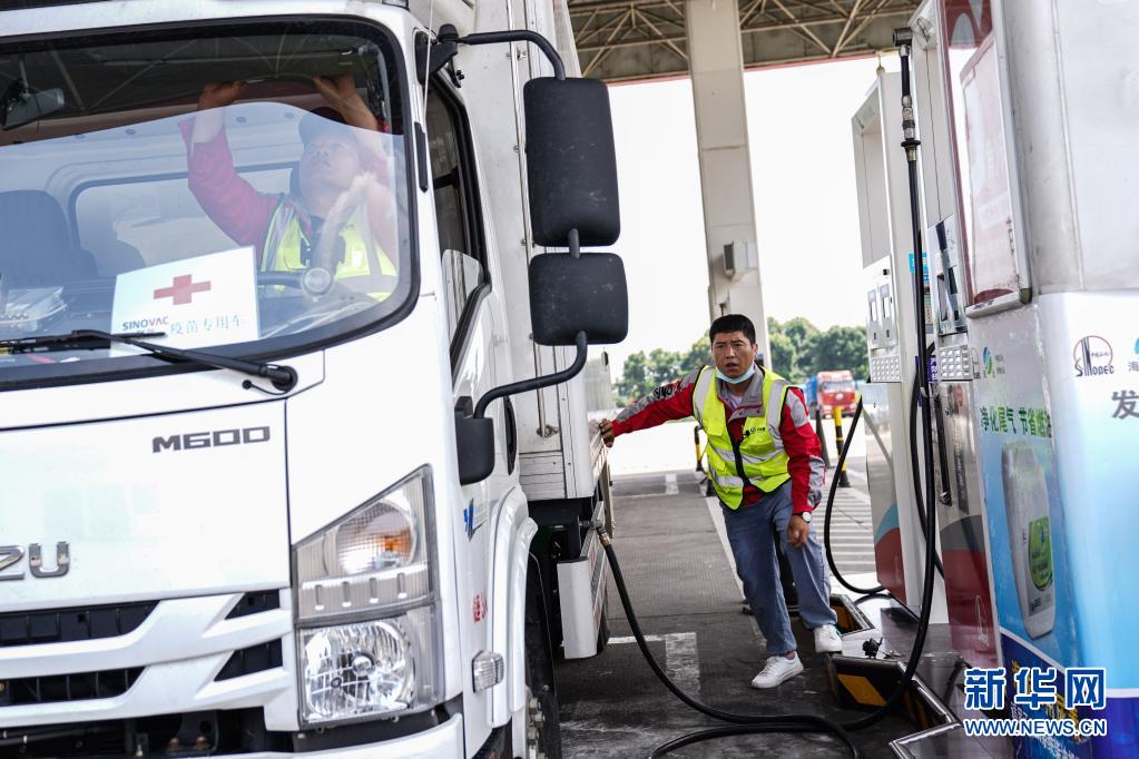 7月22日,在運(yùn)送疫苗途中,司機(jī)蘆艷會(huì)在加油站給車(chē)加油。新華社記者 彭子洋 攝