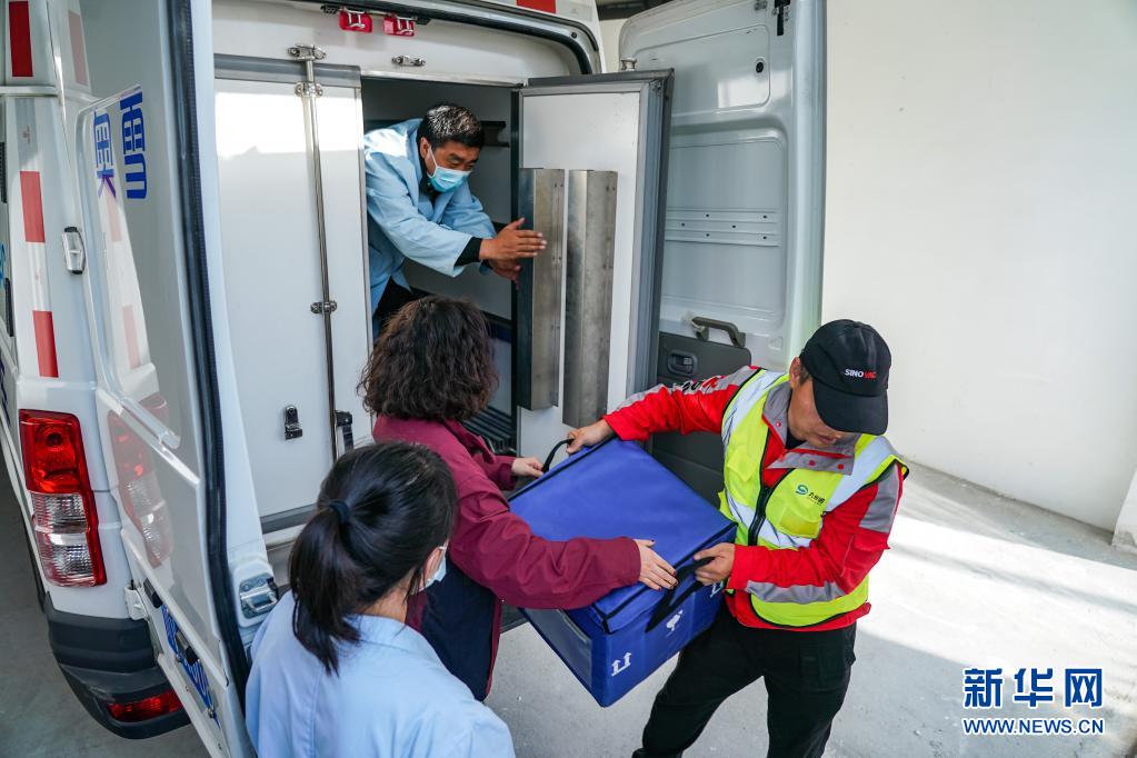 7月22日,劉思(右一)和四川甘孜州疾控中心工作人員交接疫苗。新華社記者 陳鐘昊 攝