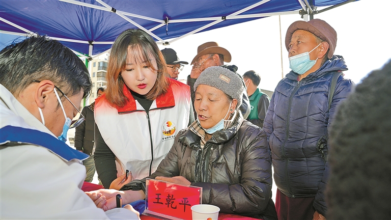 為進(jìn)一步深化社區(qū)養(yǎng)老服務(wù)體系建設(shè),切實(shí)回應(yīng)老年人的健康關(guān)切,近年來(lái),城關(guān)區(qū)奪底街道桑伊社區(qū)聚焦重點(diǎn)服務(wù)群體,創(chuàng)新探索“黨建引領(lǐng)+志愿服務(wù)+專業(yè)醫(yī)養(yǎng)”三位一體助老服務(wù)新模式,取得良好成效。圖為三沐醫(yī)養(yǎng)專業(yè)人員與桑伊社區(qū)“布谷響鈴”志愿者協(xié)同配合,為轄區(qū)老年人免費(fèi)開(kāi)展健康指標(biāo)監(jiān)測(cè)。記者 鹿麗娟 攝