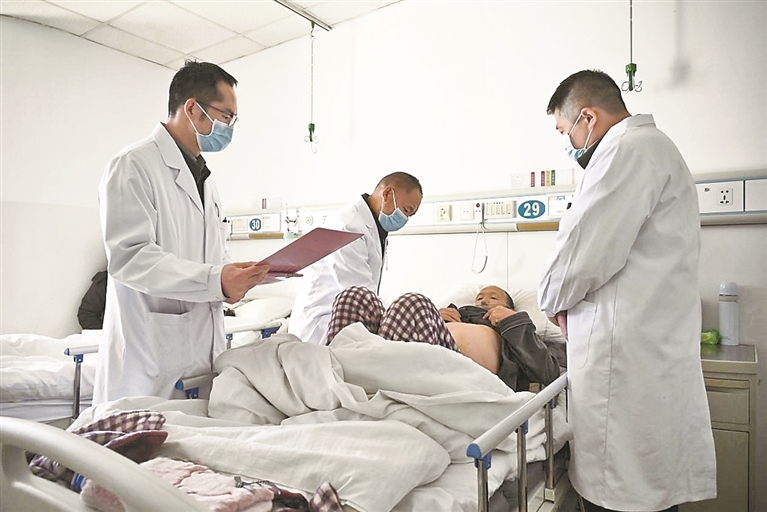 圖為西藏軍區(qū)總醫(yī)院普通外科專(zhuān)家團(tuán)隊(duì)在查房,普布次仁醫(yī)生(左二)對(duì)患者進(jìn)行腹部檢查。通訊員 西培多杰 攝