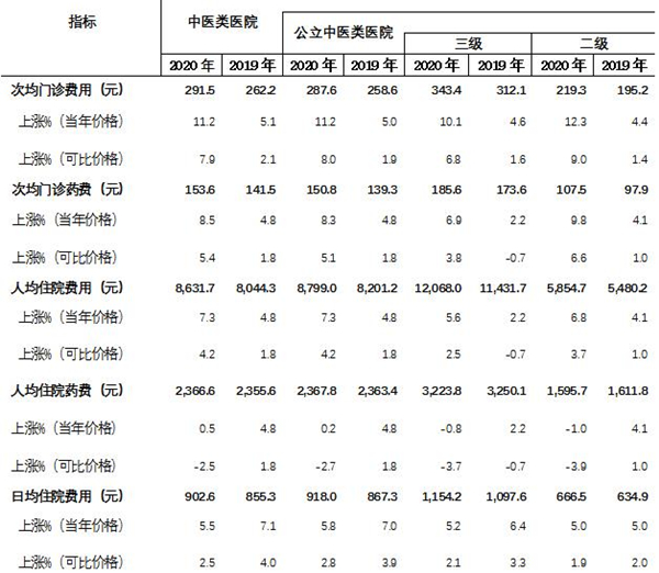 2020年中醫(yī)類醫(yī)院病人醫(yī)藥費有何變化?《報告》顯示,2020年中醫(yī)類醫(yī)院次均門診費用291.5元,按當(dāng)年價格比上年上漲11.2%,按可比價格上漲7.9%;人均住院費用8,631.7元,按當(dāng)年價格比上年上漲7.3%,按可比價格上漲4.2%。日均住院費用902.6元。