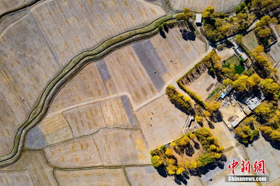 日喀則江孜縣境內(nèi)農(nóng)田、村居與金黃的樹林相映成趣。 何蓬磊 攝