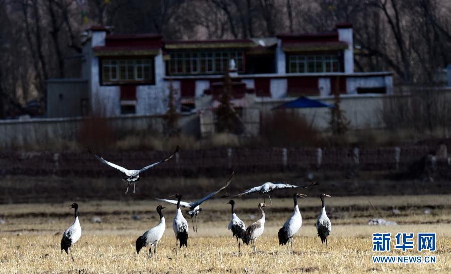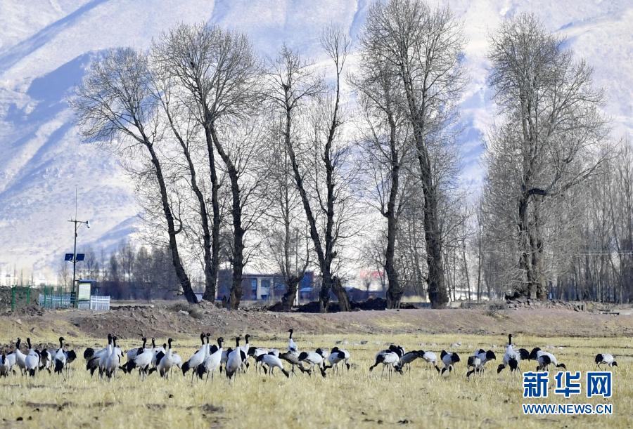 這是12月12日在林周縣黑頸鶴自然保護區(qū)卡孜鄉(xiāng)拍攝的黑頸鶴。新華社記者 黃豁 攝