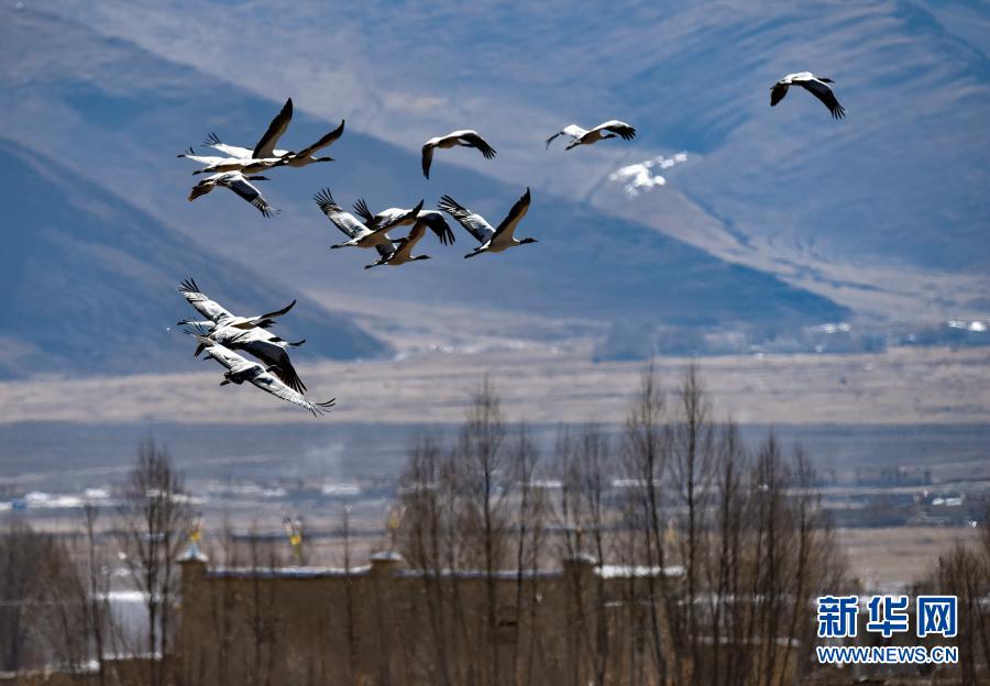 飛翔在林周縣黑頸鶴自然保護區(qū)上空的黑頸鶴集群(12月12日攝)。新華社記者 黃豁 攝