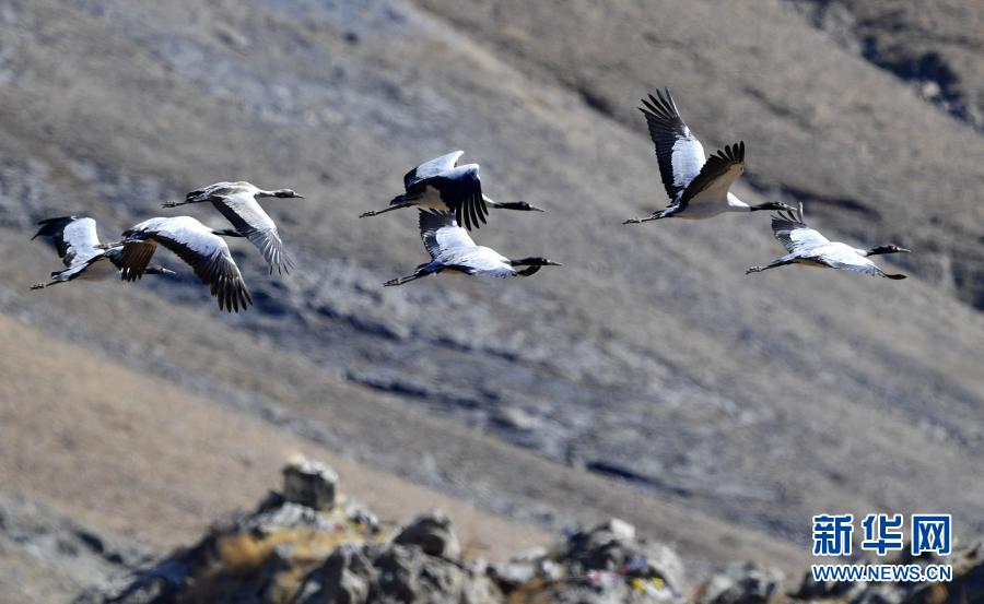 黑頸鶴在林周縣黑頸鶴自然保護區(qū)上空飛翔(12月12日攝)。新華社記者 黃豁 攝