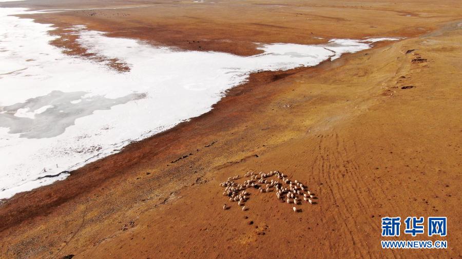 12月17日,羊群走在被冰雪覆蓋的青海湖湖畔(無人機照片)。新華社記者 張宏祥 攝